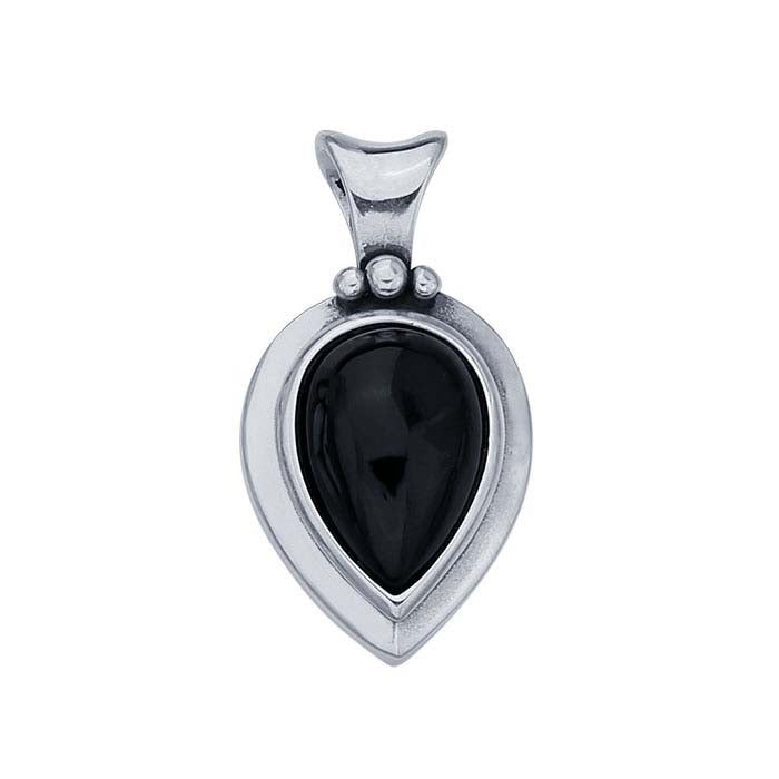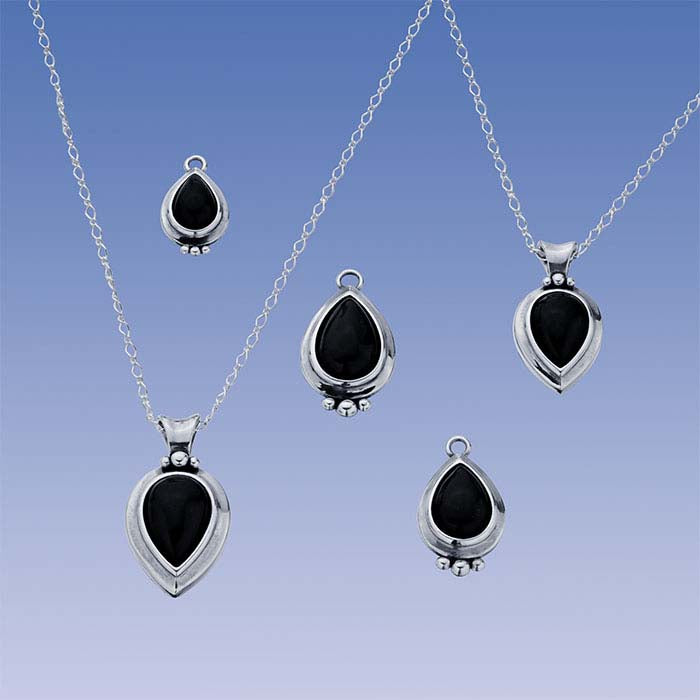 This sterling silver pendant mounting accommodates one 13 x 9mm pear-shaped cabochon and features three bead accents. The tapered bail has a smooth finish. Use jeweler's epoxy to secure the stone in place. This pendant is oxidized to accentuate the design.
