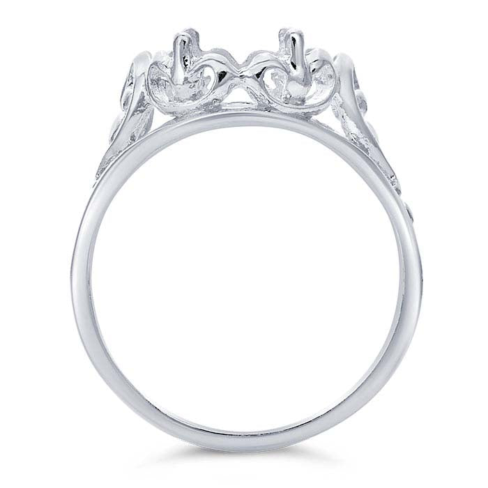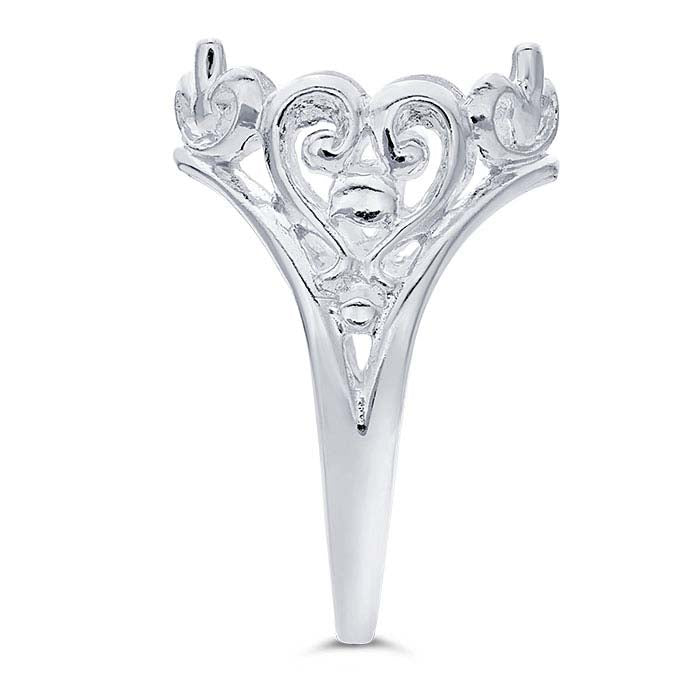 This sterling silver ring mounting features a tapered shank with an open heart-shaped scroll design and a mounting that holds one 14 x 10mm (approx.) oval cabochon or other flat-back stone. Cabochon mountings feature a flat, sometimes open, base and raised edges with two to four prongs that hold a cameo or cabochon securely in place. Set your cameo or cabochon into the mounting, then burnish the prongs over the stone to secure it in place.