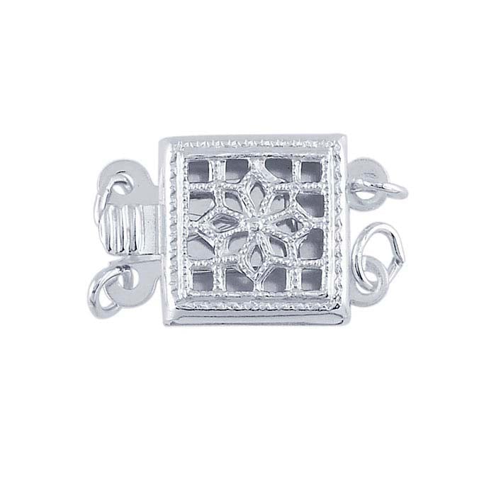 This two-strand sterling silver clasp features an open-filigree box design that complements strung bracelets and necklaces. It is easy to use and provides a secure and attractive closure for bead, pearl or mixed-material bracelets and necklaces. A box clasp is a two-part clasp with a wide, hollow box and a spring-tensioned tongue that slides into the box and snaps in place to close. Box clasps are ideal for lighter weight necklaces or those made with flat components since this clasp tends to stay flat while being worn.This clasp includes attach rings.