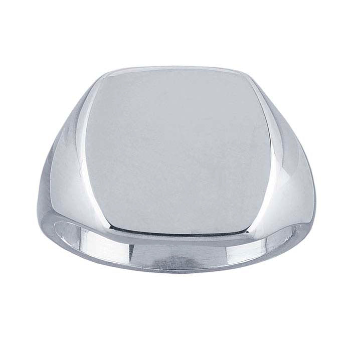 This sterling silver signet ring features an engravable 15 x 14mm cushion signet ideal for customizing the ring with a monogram, initials, or other decorative design. The signet on this ring is solid.Signet rings carry a history that goes back thousands of years to a time when a signet bore the mark of authority or conveyed status and was used in place of a handwritten signature. Today, a signet ring still conveys symbols unique to its wearer and makes an ideal gift to mark special accomplishments or achievement.