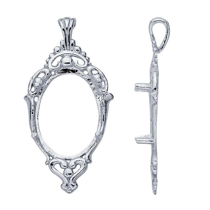 This sterling silver pendant mounting features an intricate Victorian-style swirl design with four prongs that hold one 18 x 13mm oval cabochon or other flat-back stone. The pendant has a bright finish and has a fluted tapered bail that complements the design of the mounting, making it easy to string on to cord or chain. The pendant has a bright finish; leave it bright, or oxidize the pendant to bring out the details. The mounting features a flat, open base; the open back makes it lightweight and comfortable to wear. Set your cabochon into the mounting, then burnish the prongs over the stone to secure it in place.