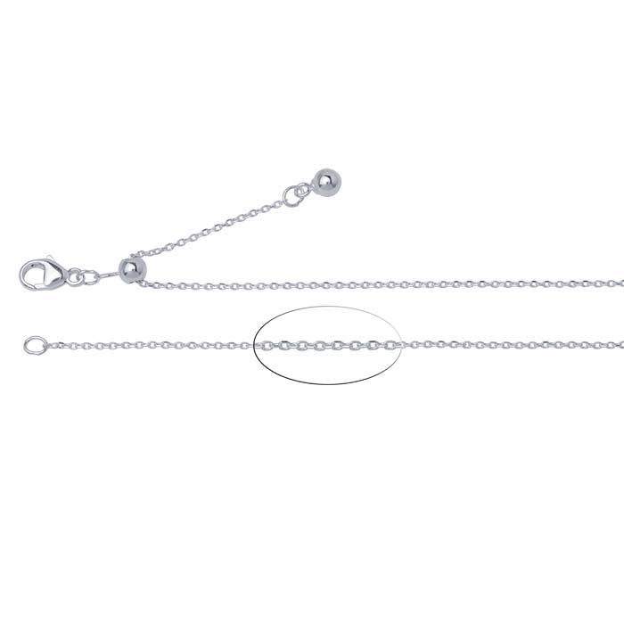 This sterling silver cable chain features a movable silicone-lined bead that allows you to adjust the chain to any length up to 22" (maximum). The end of the chain is finished with a bright ball charm. This chain is plated with fine silver to ensure a bright white color and to help protect against tarnish.