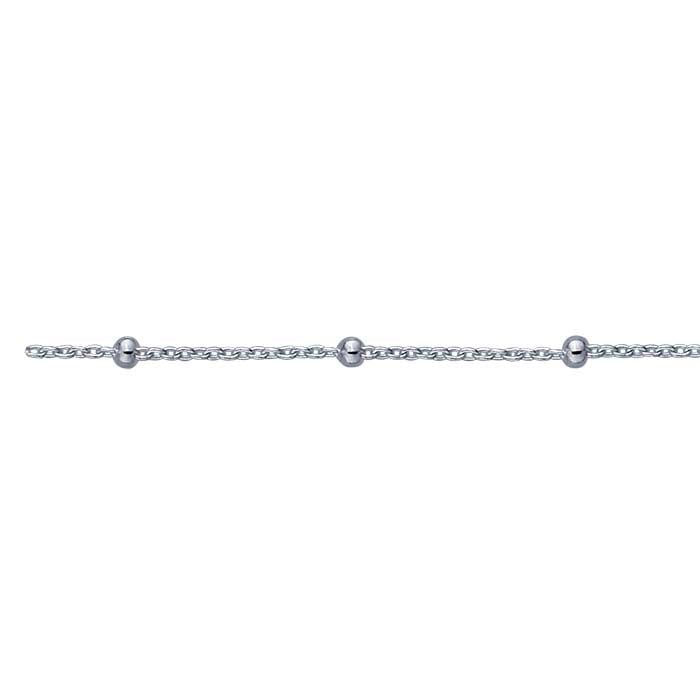 This classic sterling silver cable chain offers the added visual element of 2mm round beads spaced evenly along its length. The result is a chain that is attractive on its own, and also makes a nice complement to drops and pendants. The bright finish of the beads reflects light beautifully. This chain is plated with fine silver to ensure a bright white color and to help protect against tarnish.