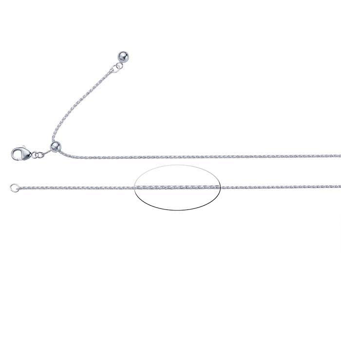 This sterling silver diamond-cut wheat chain features a movable silicone-lined bead that allows you to adjust the chain to any length up to 22" (maximum). The end of the chain is finished with a bright ball charm. This chain is plated with fine silver to ensure a bright white color and to help protect against tarnish.