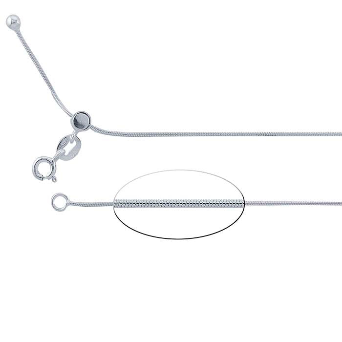 This sterling silver seamed snake chain features a movable silicone-lined bead that allows you to adjust the chain to any length up to 22” (maximum). The end of the chain is finished with a round bead accent. Seamed snake chain is created with soldered, machine-made curb-style chain that is compressed twice, producing the snake-like appearance and leaving behind a telltale seam visible along its length.