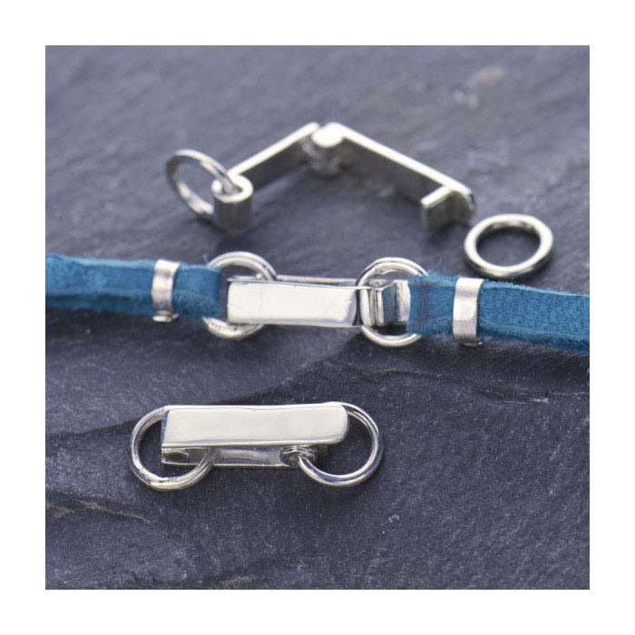 This sterling silver fold-over clasp is an ideal choice for necklace and bracelet designs made with flat leather cord. String your leather cord through the attach ring on the clasp and secure it with rivets, epoxy or stitching. Repeat to attach the opposite cord end to the free attach ring. A fold-over clasp is a hinged, one-piece clasp that folds open to accept the end ring on your strand, then folds closed, snapping in place to hold the strand securely closed. Though fairly lightweight, it is a strong clasp, ideal for beaded strands and link chain designs.