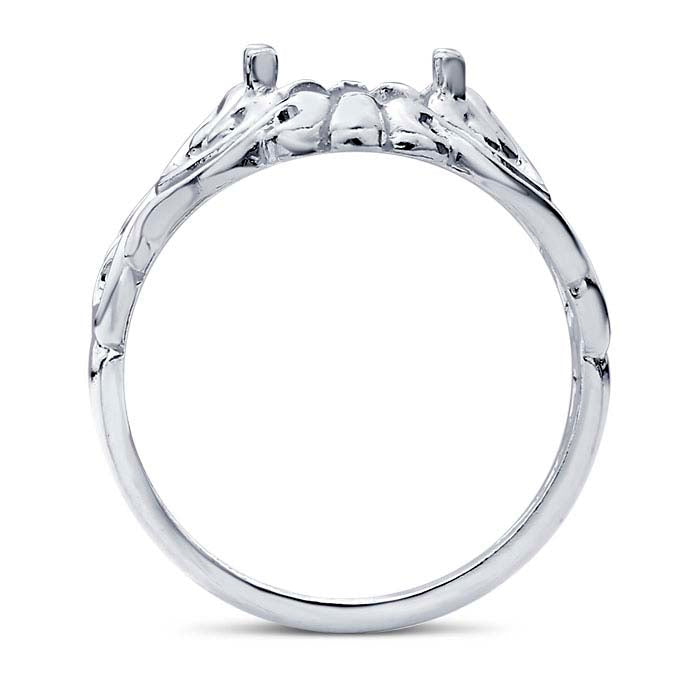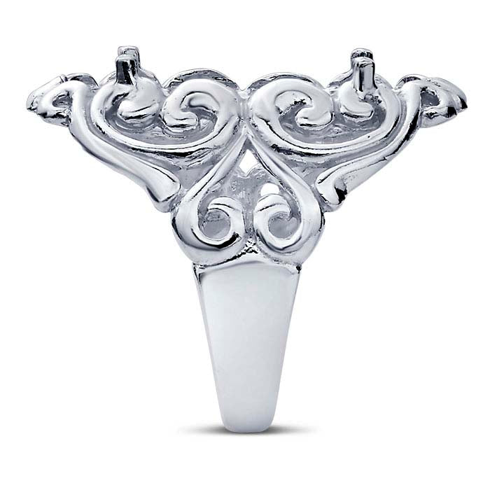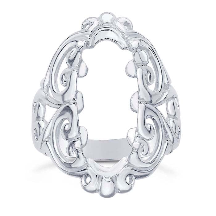 This sterling silver ring mounting features a tapered shank with an open heart-shaped scroll design and a mounting that holds one 22 x 8mm (approx.) oval cabochon or other flat-back stone. Cabochon mountings feature a flat, sometimes open, base and raised edges with two to four prongs that hold a cameo or cabochon securely in place. Set your cameo or cabochon into the mounting, then burnish the prongs over the stone to secure it in place.