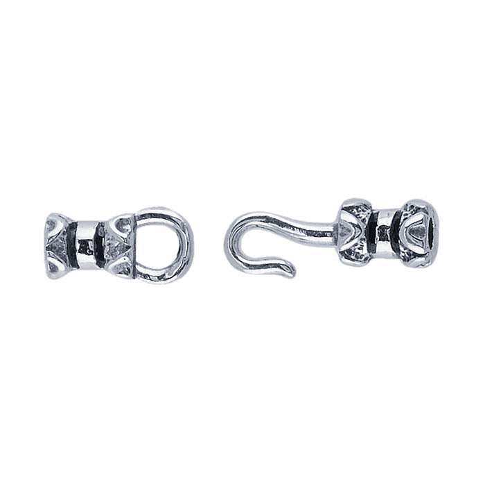 This sterling silver crimp-style hook & eye clasp features decorative zig-zag details that complement custom necklace or bracelet designs; ideal for use with rubber cord or foxtail chain. To use insert the cord or foxtail chain into the end of the clasp and crimp the center of the clasp to secure it in place. A hook & eye clasp is a two-part clasp that closes by simply sliding the hook through the eye. This clasp tends to be larger than other clasp types and is ideal for larger designs, bead strands or bib-style necklaces; it relies on the necklace having enough weight to keep the clasp secure.