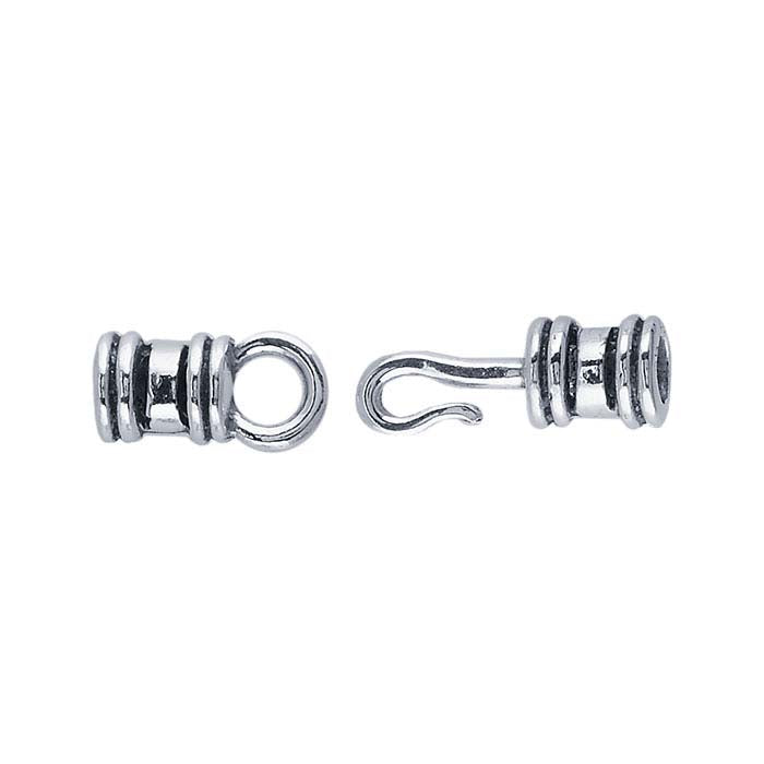 This sterling silver crimp-style hook & eye clasp features decorative double-banded details that complement custom necklace or bracelet designs; ideal for use with 2.5mm rubber cord or foxtail chain. To use insert the cord or foxtail chain into the end of the clasp and crimp the center of the clasp to secure it in place. A hook & eye clasp is a two-part clasp that closes by simply sliding the hook through the eye. This clasp tends to be larger than other clasp types and is ideal for larger designs, bead strands or bib-style necklaces; it relies on the necklace having enough weight to keep the clasp secure.