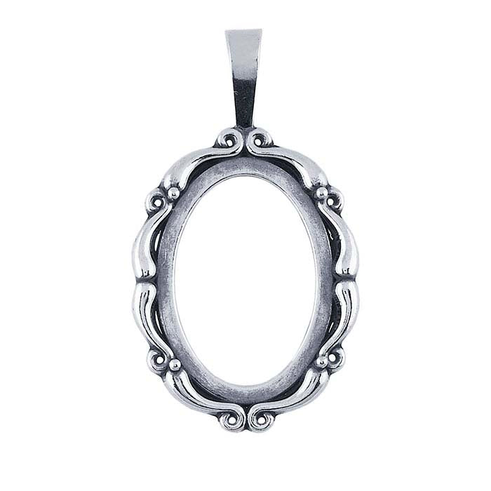 This sterling silver pendant mounting holds one 25 x 18mm oval cabochon in a 4-prong mounting. It features a raised, tapered scroll design and a narrow tapered bail that complements the design of the mounting. The pendant has an oxidized finish to bring out the details. The mounting features a flat, open base; the open back makes it lightweight and comfortable to wear. Set your cabochon into the mounting, then burnish the prongs over the stone to secure it in place.