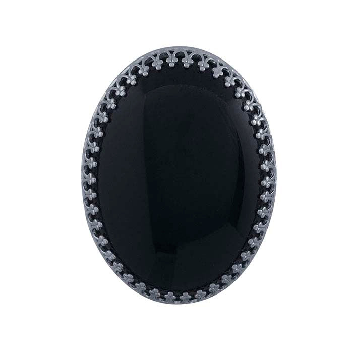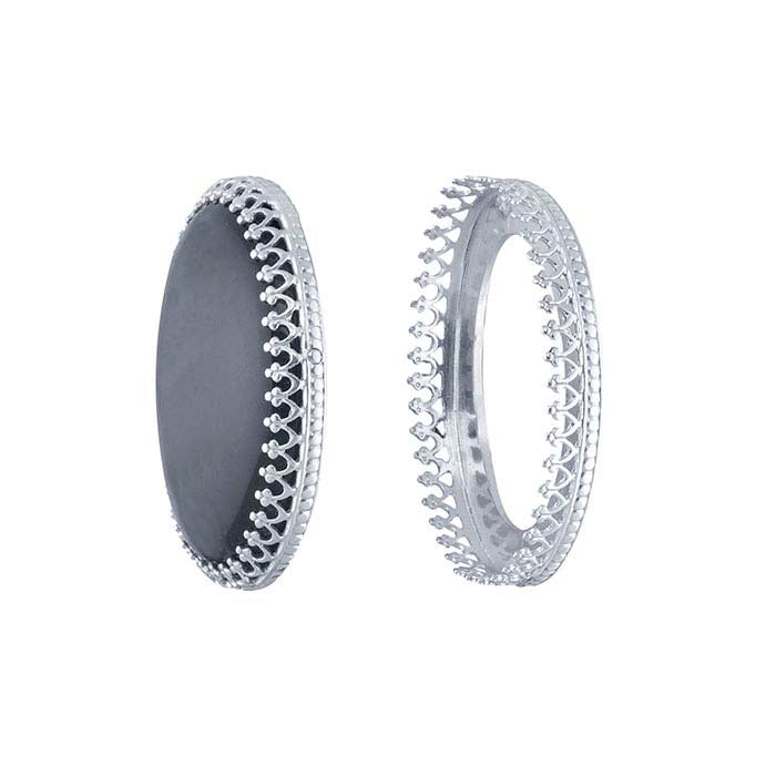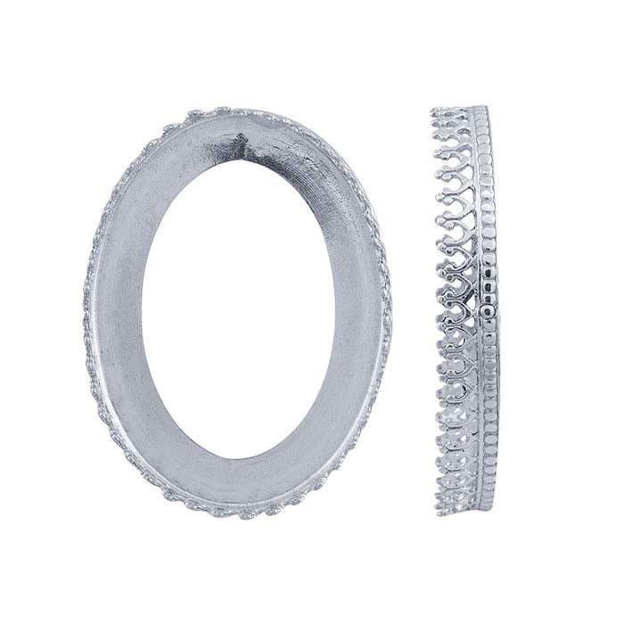 This open-back sterling silver bezel cup features a decorative, gallery-wire design and holds one 30 x 22mm oval stone or glass cabochon, flat-back stone or crystal. With walls modeled from decorative gallery wire, this bezel cup adds distinctive flair to any design. This easy-to-use bezel cup saves you time and provides clean lines and a professional-looking finish. Use it to create everything from earrings to cuff links to pendants. Simply solder the bezel cup to a finding or design, and set as desired.