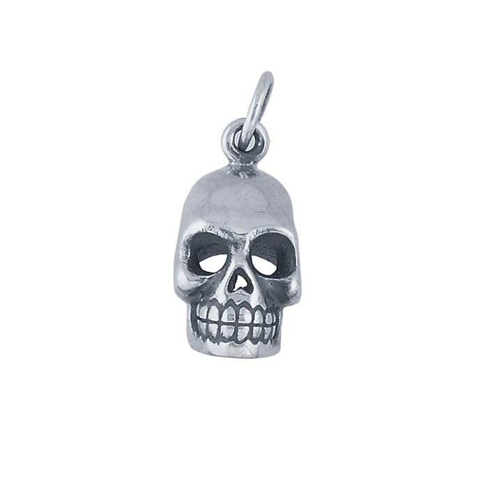 This sterling silver skull charm features a 3D design with open details that highlight the eye sockets and nose opening. The skull is hollow, making it lightweight; it is ideal for an earring drop and looks great when combined with an assortment of charms and beads in more complex designs. The charm is oxidized to highlight the details. A closed ring (.134” ID) is included, making it easy to string the charm onto a cord or chain.