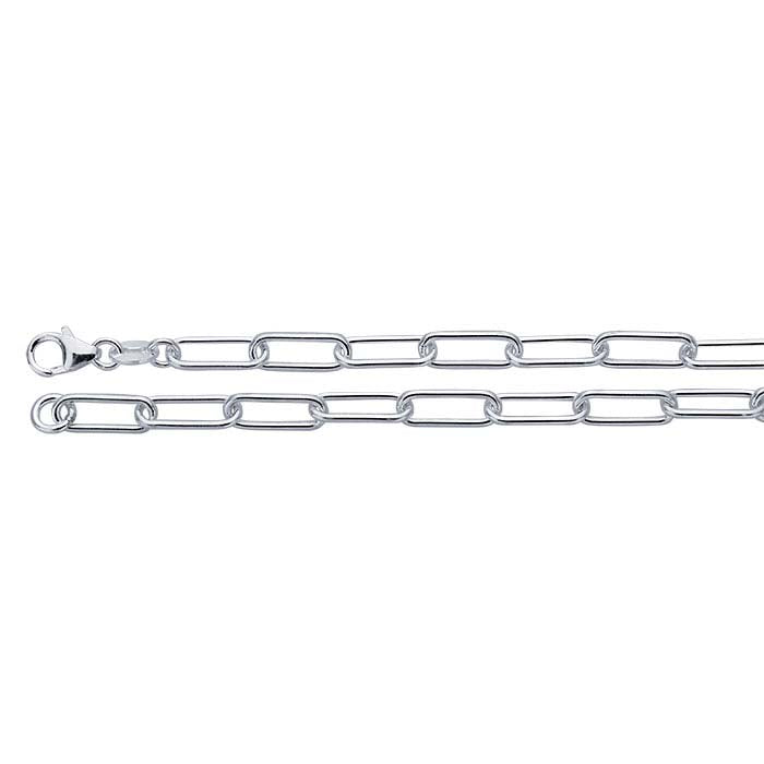 The long links on this sterling silver cable chain give it a streamlined look. Offer the chain as is, or use it as a foundation for your custom designs. This chain is plated with fine silver to ensure a bright white color and to help protect against tarnish.The most common chain style, cable chains are formed by simply connecting single links perpendicularly end to end. Links may be round, oval or other shapes.