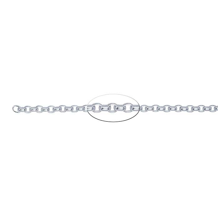The links that make up rolo chain are created from flat or semi-round wire so that each link is wider than the wire thickness. The shape of the links may be round or oval—this chain has oval links.