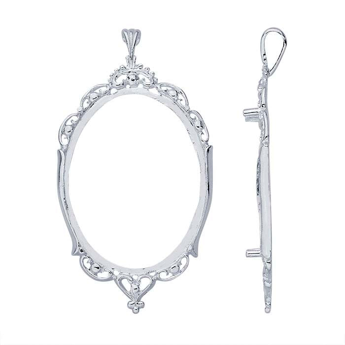 This sterling silver pendant mounting features an intricate Victorian-style swirl design with four prongs that hold one 40 x 30mm oval cabochon or other flat-back stone. The pendant has a bright finish and has a fluted tapered bail that complements the design of the mounting, making it easy to string on to cord or chain. The pendant has a bright finish; leave it bright, or oxidize the pendant to bring out the details. The mounting features a flat, open base; the open back makes it lightweight and comfortable to wear. Set your cabochon into the mounting, then burnish the prongs over the stone to secure it in place.