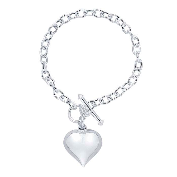 This bright sterling silver cable chain bracelet is adorned with a puffed heart charm and features an easy to use toggle clasp. The most common chain style, cable chains are formed by simply connecting single links perpendicularly end to end. Links may be round, oval or other shapes. This bracelet is plated with fine silver to ensure a bright white color and to help protect against tarnish.