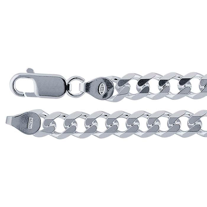 This sterling silver curb chain features beveled links that catch the light and lie flat, giving the chain added brilliance and interest. It's ideal for designs that call for an industrial, streamlined look—offer it as-is, or add pendants, drops or dangles for a more complex design. This chain is plated with fine silver to ensure a bright white color and to help protect against tarnish.