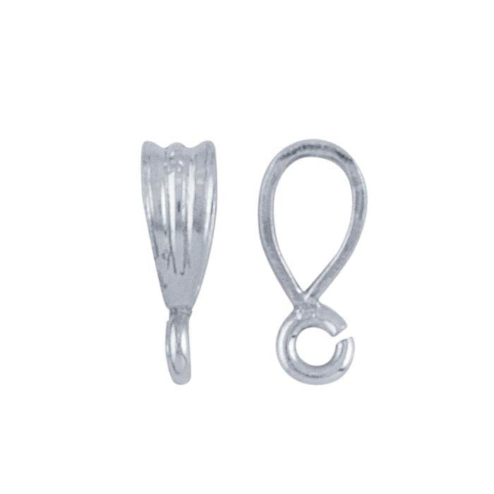 This sterling silver bail features a tapered, ridged design and an open ring at its base. Its smooth finish and classic styling complements your pendant design. Attach a drop, dangle or other design component to complete the pendant. Consider oxidizing the bail to highlight the details.