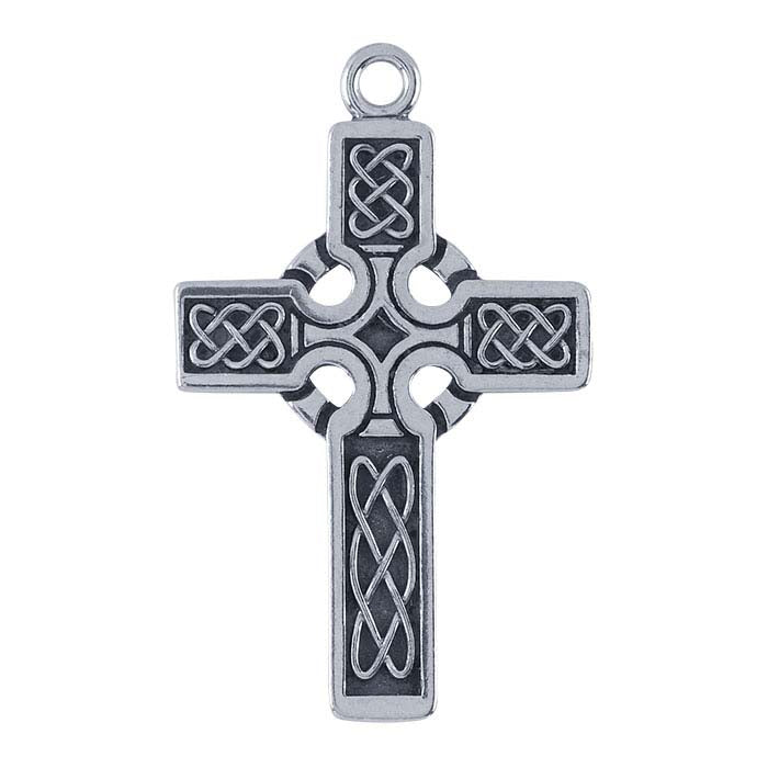 This sterling silver cross pendant features an intricate Celtic design with openings around the center of the cross; the background is oxidized for contrast. Use it alone to create a necklace, or combine it with a variety of charm and component styles to create a more complex necklace made with chain or cord. Attach your choice of bail to the pendant, and string it onto chain or cord for an eye-catching necklace.