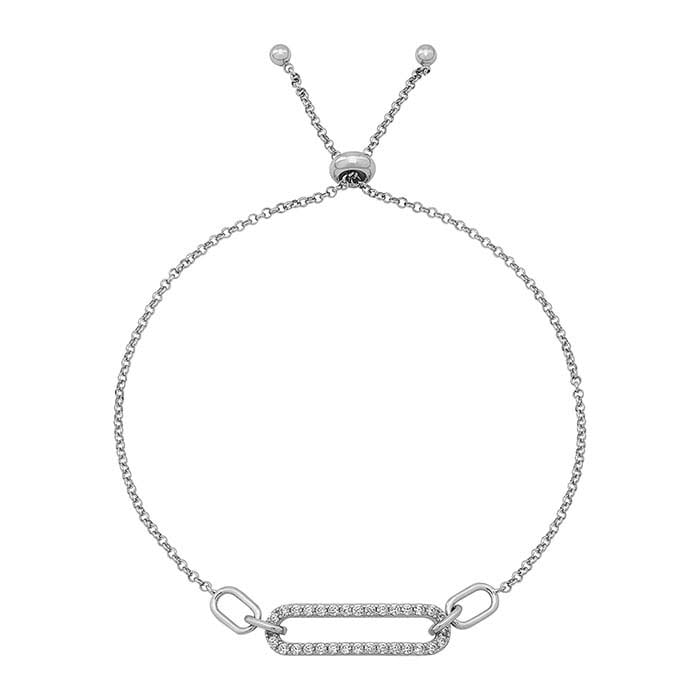 This sterling silver rolo chain bracelet features a paperclip design that is set with several round 1.5mm white CZs; it looks great on its own or as part of a stacked look. The bracelet is finished with a silicone-lined bead that allows your customers to adjust the chain length. It includes a ".925" sterling silver stamp as a symbol of guaranteed product quality.