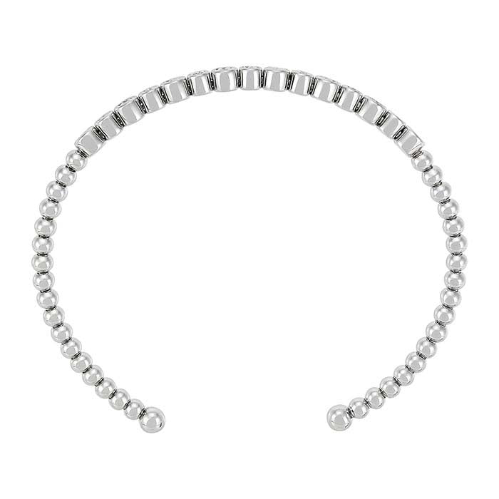 Bezel-set round white diamonds (I1 clarity/G–I color; 1/10CTTW) line the top of this sterling silver cuff, creating the illusion of an eternity style. It's finished with brightly finished beads and is meant to be worn tighter at your customer's wrist. The piece comes with a ".925" sterling silver stamp as a symbol of guaranteed product quality.