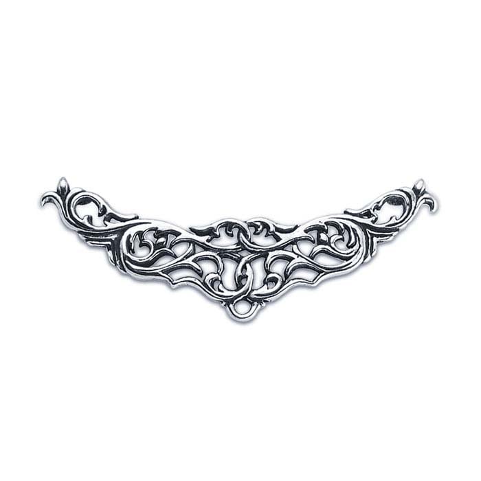 This sterling silver festoon features an intricate open filigree pattern that is ideal for necklaces, bracelets or anklets; create a simple design element, or use multiple pendants in sequence to form a larger pattern. A cleverly designed attach ring at the bottom tip of the pendant can be used to add a dangle, or left open. The oxidized finish highlights the texture and design of the pendant; hidden closed rings at each end create a seamless finish when it is set in place and keep it correctly oriented in your finished piece.