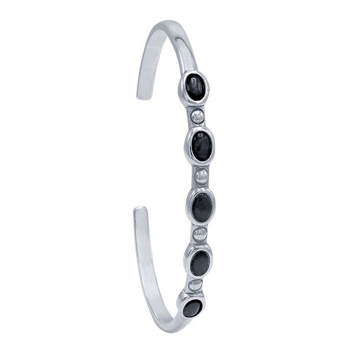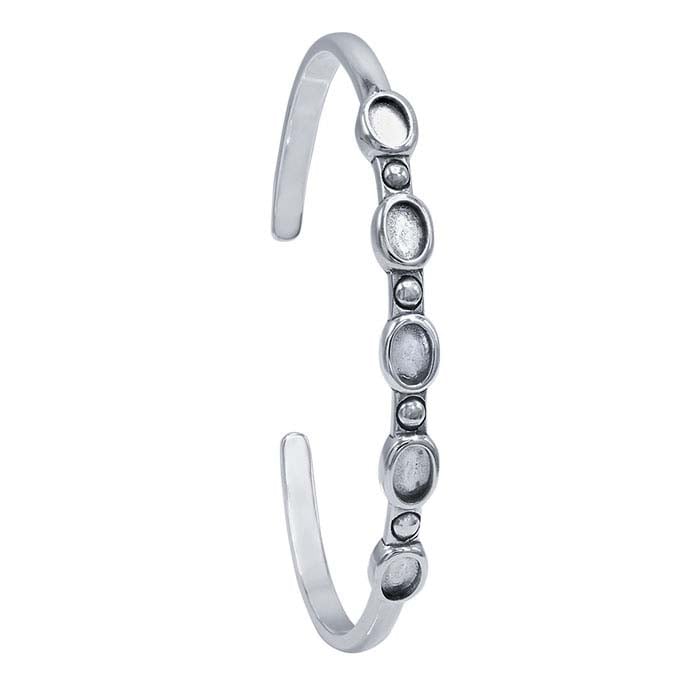 This sterling silver cuff bracelet features five oval bezel mountings with small bead accents between them and light oxidation that highlights design details. Set the mountings with five 6 x 4mm oval cabochons. Secure stones in place with jeweler's epoxy.