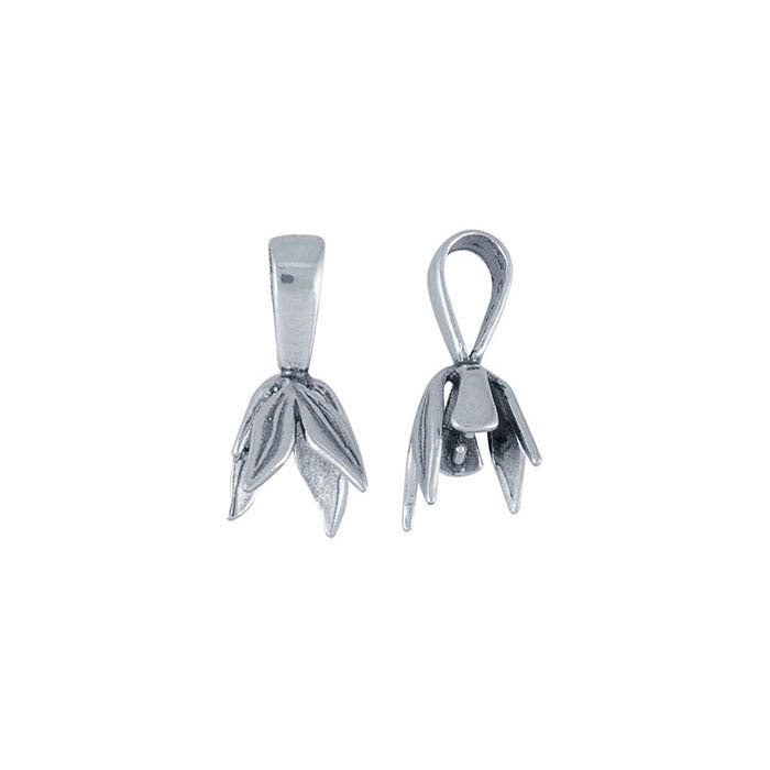 This sterling silver pinch bail mounting features a smooth, tapered bail and a clustered-leaf cap with pegs on two opposing leaves. The bail holds a drilled briolette or finding (3.6mm, max.) to easily create a stylish pendant. Simply open the bail, trim the pegs as needed and then squeeze or pinch the outer portion until the facing pegs begin to enter the holes of the bead. Slowly close the bail until both points are inside the bead hole. For a permanent mounting, use jeweler's epoxy to secure the pegs inside the holes. The bail is oxidized to enhance the details.