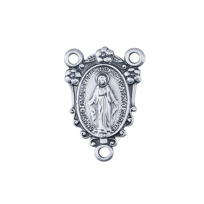This sterling silver rosary center pendant features a Miraculous Medal—also known as the Medal of the Immaculate Conception—design with fine details and floral accents. The pendant has a design on both sides. Attach the pendant to chain or bead designs to complete the rosary. The pendant is oxidized to highlight the details.