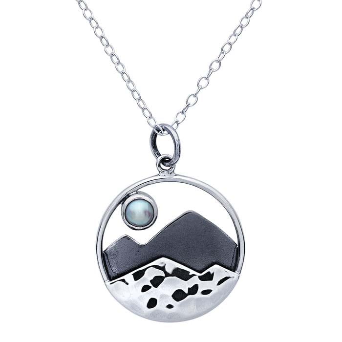 This finished sterling silver necklace features a mountain with a pearl moon pendant that is oxidized to highlight the details. The necklace is completed with a spring ring clasp. It has a ".925" sterling silver stamp as a symbol of guaranteed product quality.