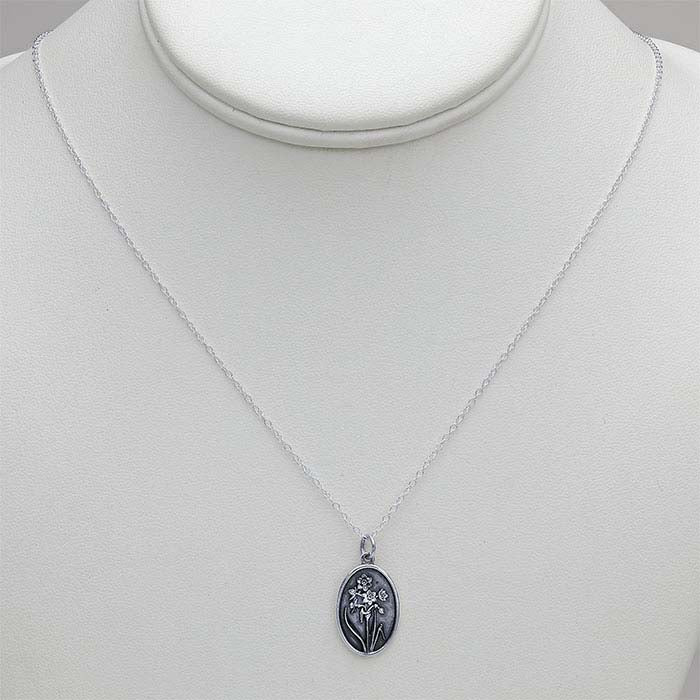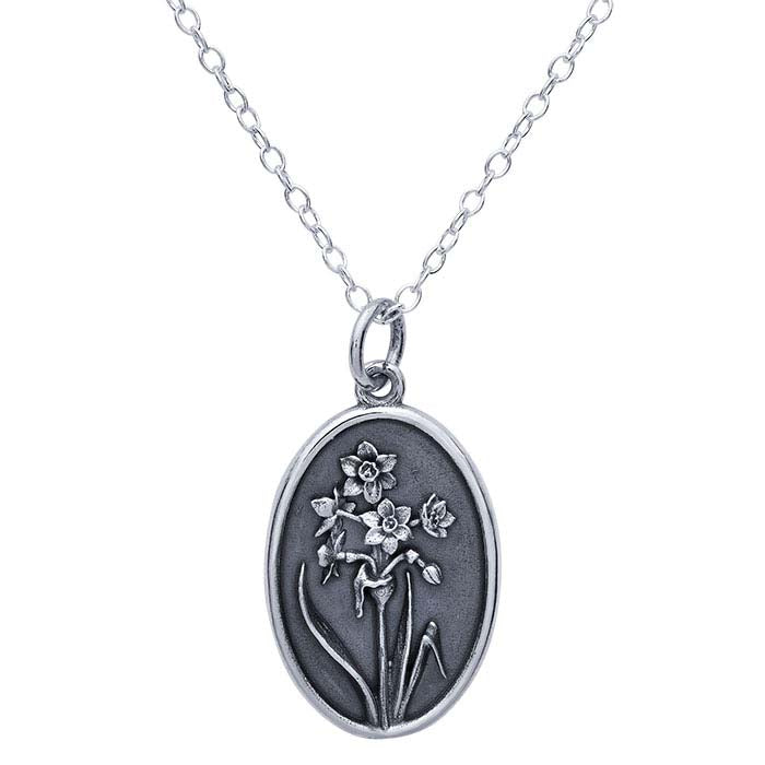 This finished sterling silver necklace features a narcissus flower pendant that is oxidized to highlight the details. The necklace is completed with a spring ring clasp. It has a ".925" sterling silver stamp as a symbol of guaranteed product quality. The narcissus is one of the birth flowers for December.