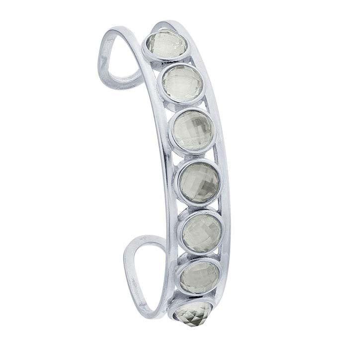 This sterling silver continuous-wire cuff bracelet mounting features seven 8mm round glue-in mountings—mix or match cabochons or flat-back crystals to create classic, dramatic or whimsical color palettes. Follow the latest color trends, or create your own best-sellers! Use jeweler’s epoxy to secure stones in place.
