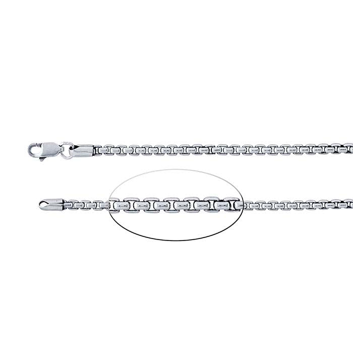 Box chain has squared-off links that resemble cubes; they are sturdy chains, ideal for pendants. In rounded box chain, the links are created from half-round wire, giving the finished chain a rounder profile.