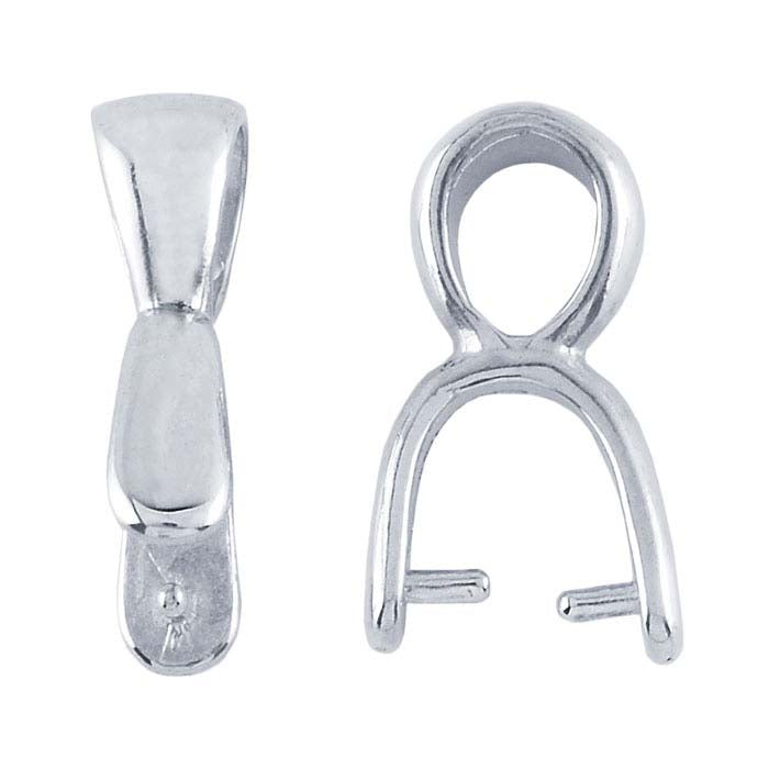This sterling silver pinch-style bail features a smooth, tapered bail and a teardrop design with a bright finish; the double-bail design leaves more room for larger-size drops or beads. The pinch bail holds a drilled briolette, bead or other finding for a simple and elegant pendant. Simply open the bail, trim the pegs as needed and then squeeze or pinch the outer portion until the facing pegs begin to enter the holes of the bead. Slowly close the bail until both points are inside the bead hole. For a permanent mounting, use jeweler's epoxy to secure the pegs inside the holes.