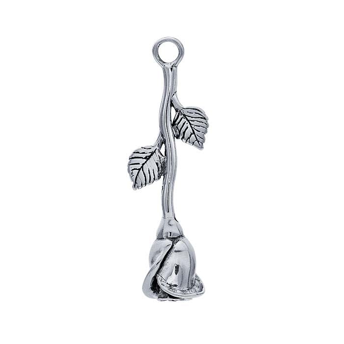 This sterling silver pendant features a detail rosebud design complete with two leaves, a stem and thorns. It is oxidized to accentuate the design details. This pendant looks great on its own or in combination with other pendants and charms in more complex designs.