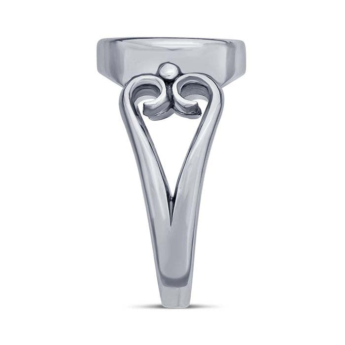 This sterling silver ring mounting features an open heart-shaped filigree design and a bezel mounting that holds a 10mm round cabochon. The split-shank design is tapered for comfort and has a single bead detail at the top of each end. The shank is oxidized to highlight the detail. Use jeweler's epoxy or traditional bezel techniques to secure the stones in the mountings. Place your stone in the bezel and push the walls inward over the stone, holding it in place. For added security, if desired, place a drop or two of jeweler's epoxy in the cup before placing the stone.