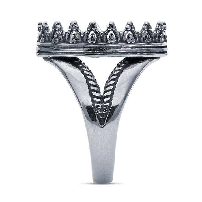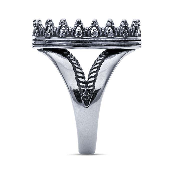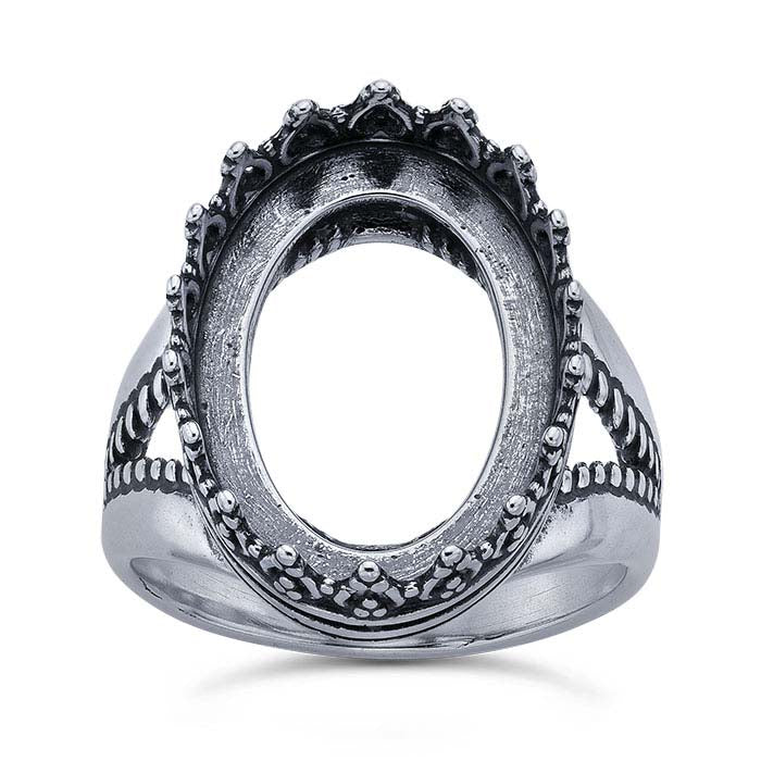 This sterling silver split-shank ring mounting features a bezel mounting with decorative walls gallery wire walls and holds one 18 x 13mm oval cabochon or other flat-back stone. Use traditional bezel-setting techniques to secure the cabochon in the mounting. Place your stone in the bezel and push the walls inward over the stone, holding it in place. For added security, if desired, place a drop or two of jeweler's epoxy in the cup before placing the stone.