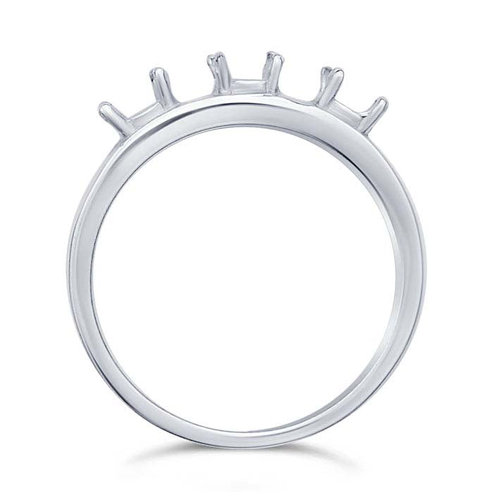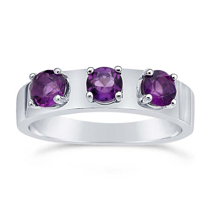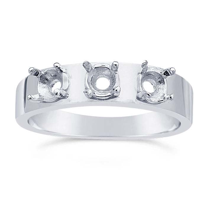This bright sterling silver three-stone ring mounting features a flat tapered shank design with three mountings across the top of the ring. Each 4-prong mounting accommodates one 4mm round faceted gemstone. Mix and match stone types and/or colors to create a variety of ring choices, or let your customer choose the stones to create a custom ring they will love.