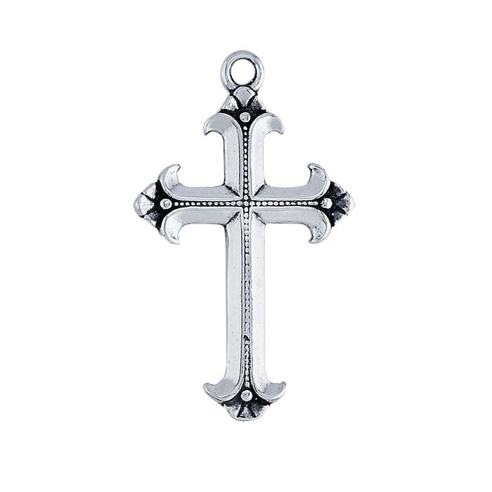 This sterling silver cross pendant features ornate, flared ends with beaded accents. A single large bead highlights the end, and a line of smaller bead details lines the horizontal and vertical arms of the cross. Attach a bail to and string the pendant onto a chain or cord to create a simple necklace, or create eye-catching designs by partnering it with other pendants and strung components in more complex necklace designs. The pendant is oxidized to highlight the details.