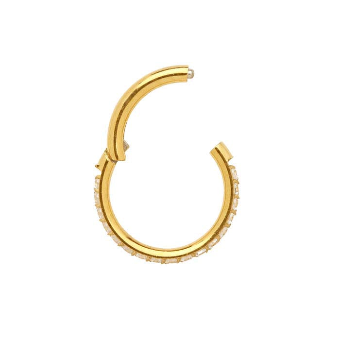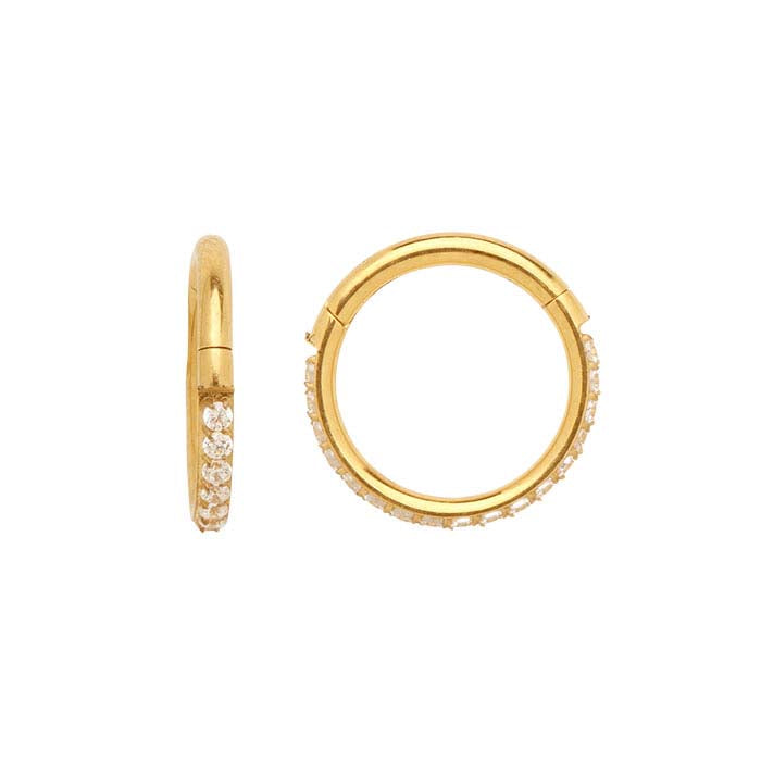 Ideal for your body jewelry line, this clicker is set with 17 round white CZs and is made from biocompatible, implant-grade titanium that is plated with 18-karat yellow gold. The easy-to-use hinged design provides a click sound when the clicker is securely closed.