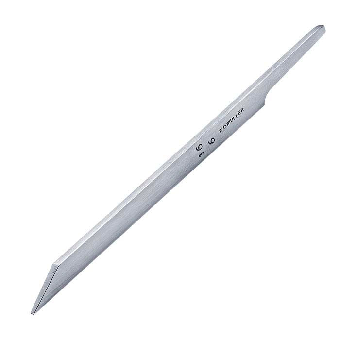 Este buril de linha reta E.C Muller #16 oferece seis linhas espaçadas uniformemente (0.2mm de distância) na superfície de corte da face do buril (a largura é aproximadamente 1.2mm). Buris de linha estão disponíveis com diferentes quantidades de linhas na superfície de corte e o número do tamanho do buril define a largura entre essas linhas. Use buris de linha para letras em bloco, acabamentos florentinos, sombreamento de fundo e padrões de cruzamento em superfícies metálicas planas ou convexas; são especialmente ideais para estilos de gravação ocidentais. Escolha buris de linha reta para a maioria das aplicações; encurte, molde e afie a face conforme necessário para o trabalho que está a realizar. A composição em aço de alto carbono deste buril permite que seja facilmente moldado e afiado—adequado para uso em todos os tipos de metal.