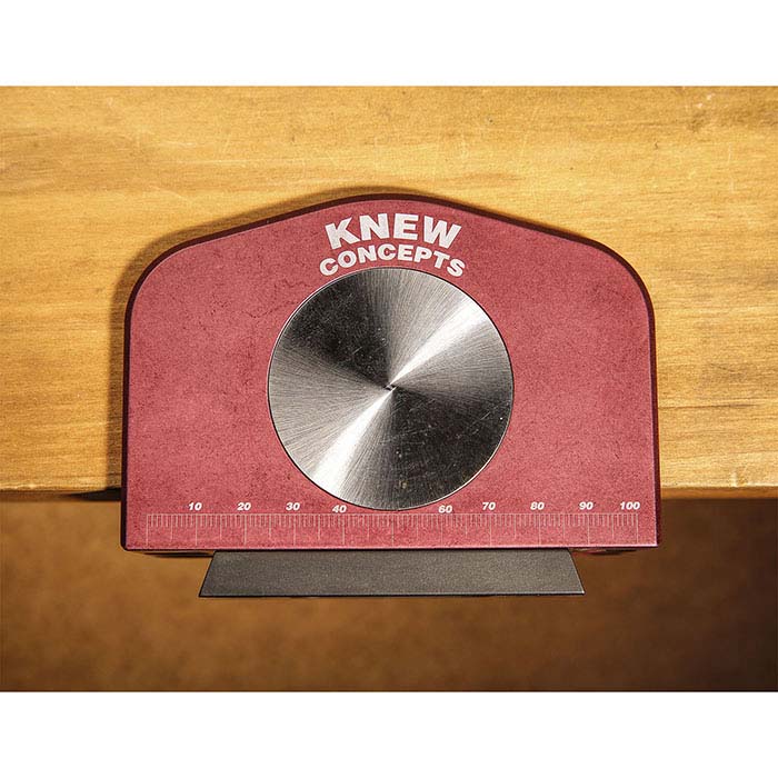 This Knew Concepts bench clamp features a dovetail mounting plate that accommodates the Knew Concepts blanking die saw, rotational bench pins and many other accessories. This model also features a built-in 2"-diameter anvil that provides a hardened tool steel surface ideal for shaping metal without having to move away from your bench. The front edge is marked with a high-contrast 100mm ruler, making it easy to double-check measurements as you work. Secure the mounting plate on any bench or work surface with the knurled hand knob—no need to drill holes or set it permanently. The clamp is made in two parts of aircraft-quality aluminum and can be reconfigured at various offsets to allow the clamping screw to accommodate any work surfaces from 3/4" to 3-3/4" thick. The aluminum is hard-anodized to prevent the contamination of files or other cutting tools that might inadvertently contact the aluminum surface. To prevent corrosion, the clamp is coated in turtlewax and can be removed with WD-40.