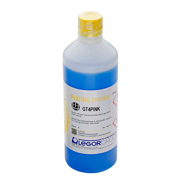 Legor® GT4PINK solução de deposição pesada permite banhar peças com uma cor rosa profunda que é realmente 18 quilates e até 5 microns de espessura. Como a solução é à base de ácido (a primeira solução de banho de ouro rosa à base de ácido) em vez de cianeto, a manutenção do banho ao longo do tempo é tão fácil quanto para outras soluções de ouro à base de ácido. Esta solução é especialmente ideal para aplicações de banho decorativo que requerem ouro duro ou maior espessura (até 5 microns) com cor fiável. Use esta solução de banho com um ânodo de titânio platinizado. O ouro na solução é co-depositado com cobre, gerando uma liga que é 75% 18K. Contém 4g de ouro rosa 18 quilates.