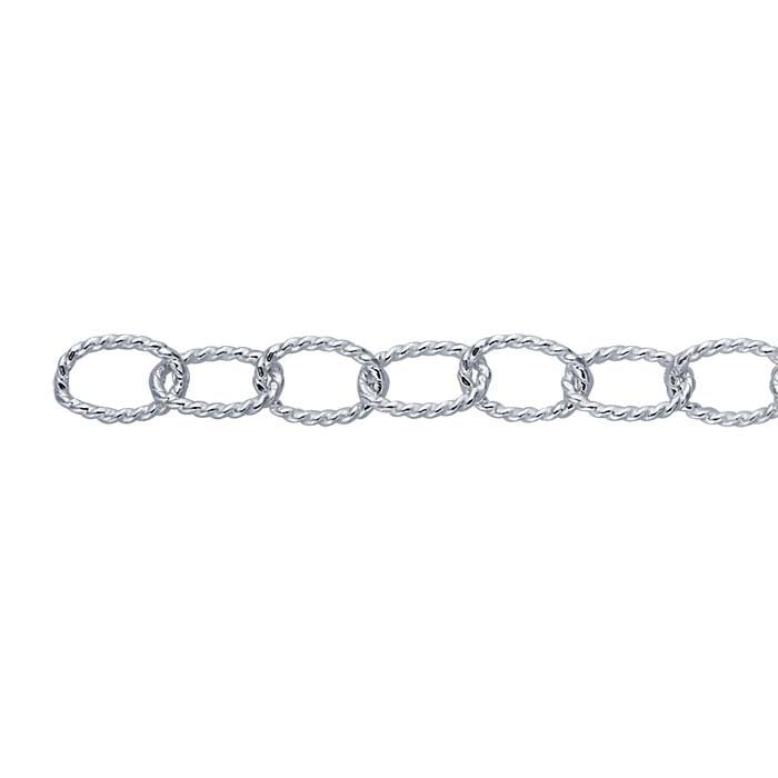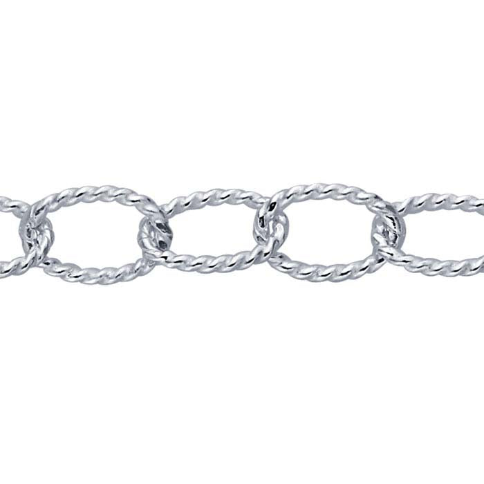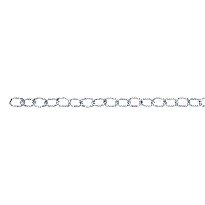 Pattern links on this sterling silver oval cable chain add modern twist to a classic profile. Offer this chain as is, or use it as a foundation for your custom designs. This chain is plated with fine silver to ensure a bright white color and to help protect against tarnish.The most common chain style, cable chains are formed by simply connecting single links perpendicularly end to end. Links may be round, oval or other shapes.This chain is sold by the foot, so it's easy to buy as much or as little length as you need.