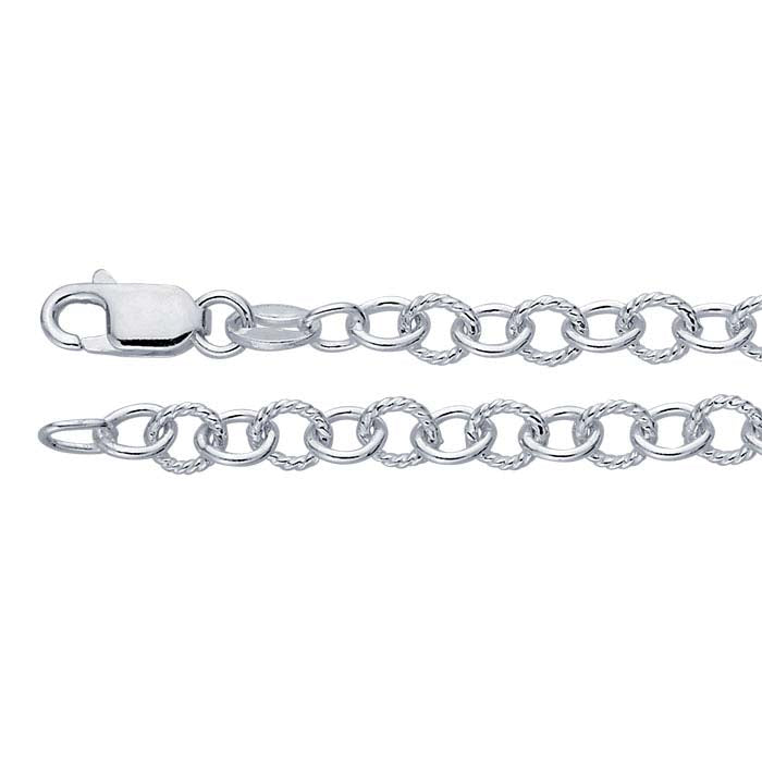 Smooth links alternate with twisted links on this sterling silver cable chain creating interest. Offer the chain as is, or use it as a foundation for charms, drops and pendants. This chain is plated with fine silver to ensure a bright white color and to help protect against tarnish.The most common chain style, cable chains are formed by simply connecting single links perpendicularly end to end. Links may be round, oval or other shapes.