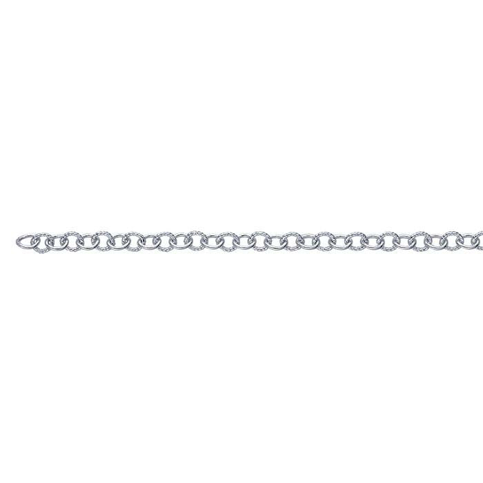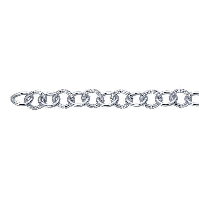 Smooth links alternate with twisted links on this sterling silver cable chain creating interest. Offer the chain as is, or use it as a foundation for charms, drops and pendants. This chain is plated with fine silver to ensure a bright white color and to help protect against tarnish.The most common chain style, cable chains are formed by simply connecting single links perpendicularly end to end. Links may be round, oval or other shapes.This chain is sold by the foot, so it's easy to buy as much or as little length as you need.