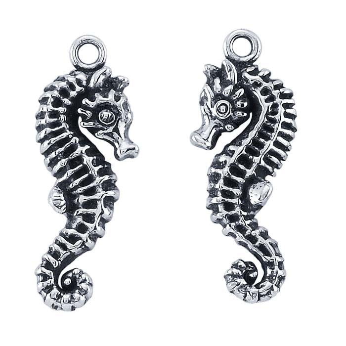 This set of sterling silver components features a facing pair of seahorses with intricate details; the back of each component is flat. They are ideal for earrings or mirror-image designs for necklaces. Add an ear wire to each component for an earring drop, or add a bail or jump ring to each component and string them on cord or chain for a necklace. The components are oxidized to highlight the fine details.