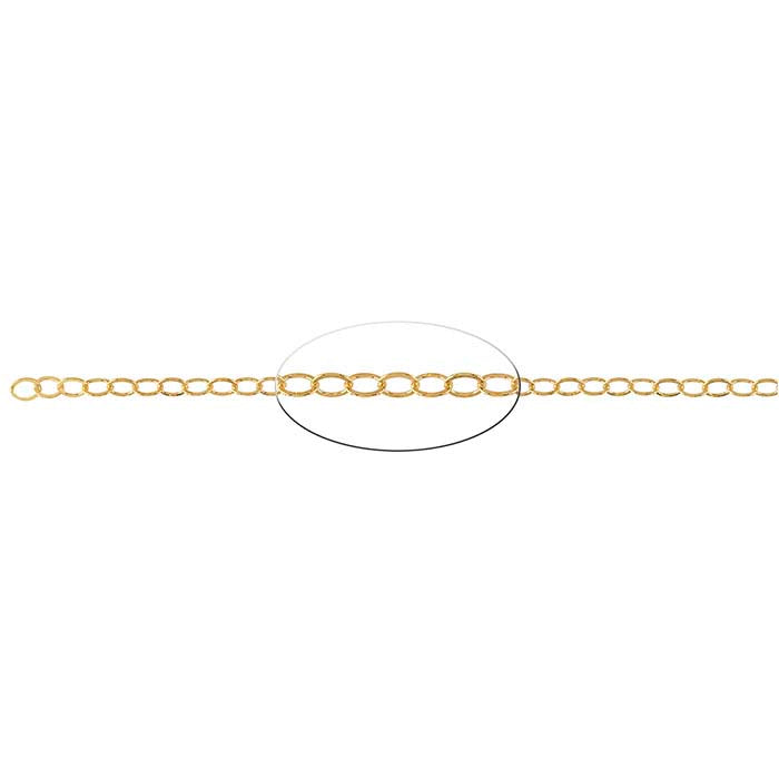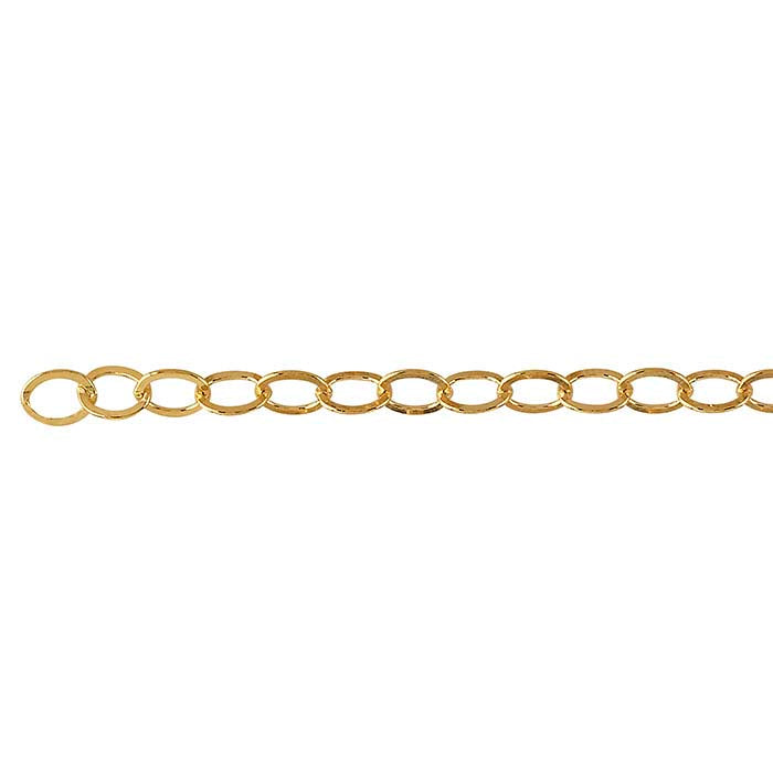 Ofereça aos seus clientes o aspeto clássico e a cor rica do ouro a um preço mais acessível. Esta corrente de cabo oval plana leve em ouro amarelo 14/20 é simples mas elegante. Esta corrente é vendida por pé, por isso é fácil obter a quantidade que deseja.