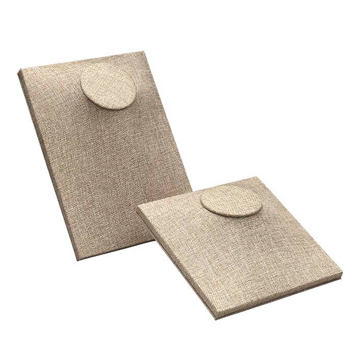 Este busto para colares apresenta um cavalete dobrável de dupla posição fácil de usar — pontos de fixação de gancho e argola permitem alterar o perfil do expositor para melhor adequar-se à sua peça de joalharia. Ajuste-o para apresentar um perfil de ângulo baixo com apenas 11,5 cm de altura, ou escolha um perfil quase vertical com 21,5 cm de altura. Os contornos deste busto conferem aos colares e pendentes uma queda natural em ambos os perfis, mostrando aos clientes como a joalharia ficará quando usada. Ajuste o colar ao comprimento perfeito para uma apresentação elegante — na posição mais alta pode passar o excesso da corrente pelos orifícios que fazem parte do cavalete na parte de trás do expositor. O cavalete dobra-se para ficar plano, facilitando o armazenamento e transporte. O tecido natural de estopa cobre uma forma almofadada de cartão.
