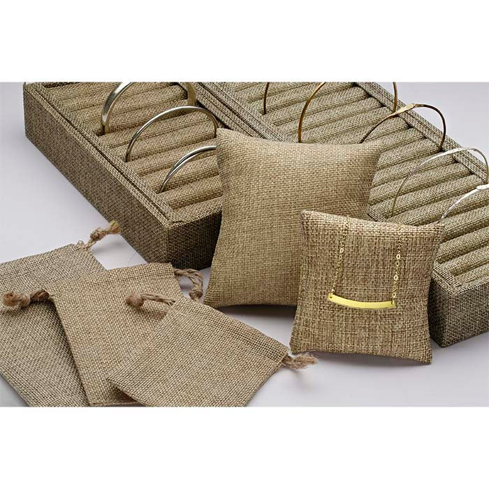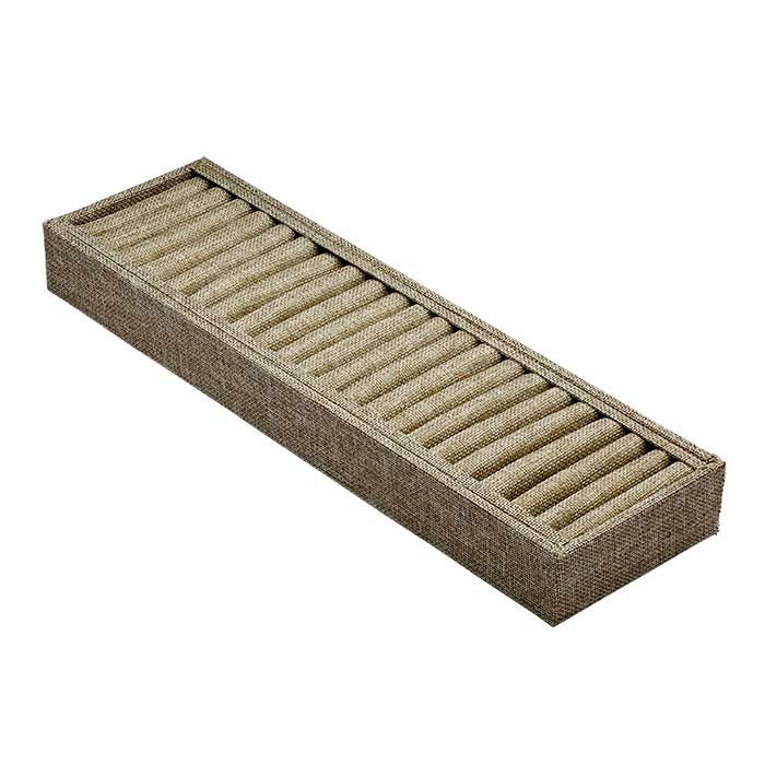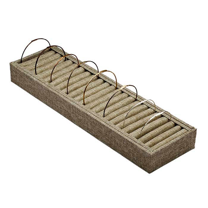 Este expositor de juta natural suporta até 21 pulseiras tipo bracelete ou braceletes finos, cada uma no seu próprio espaço individual e mantida na vertical para uma visualização ótima. A juta natural oferece uma cor suave e uma textura tecida visível, sendo uma excelente escolha para estilos de exposição contemporâneos e casuais. Exponha uma pulseira em cada espaço ou deixe espaços entre elas para um aspeto mais espaçoso. As linhas simples do expositor complementam qualquer design de pulseira, e tanto metais brancos como amarelos — assim como cores vivas — destacam-se bem contra a cor e a trama do tecido. O expositor robusto é ideal para mostrar joias numa vitrina e também é fácil de embalar e transportar. A base e a estrutura são feitas de madeira e cartão cobertos com juta natural; o interior apresenta espaços almofadados para pulseiras que também estão cobertos com juta.